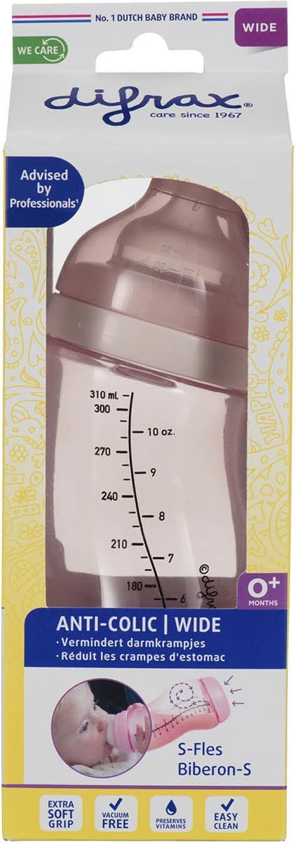 De Difrax S-fles Wide 310 ml Blossom is de populairste babyfles voor baby, papa en mama. Het speciale anti-darmkrampjes ventiel en de S-vorm zorgen voor een constante stroom van flesvoeding. De S-fles Anti-colic is vanaf de geboorte te gebruiken en ideaal in combinatie met borstvoeding. Ook fijn als papfles te gebruiken.