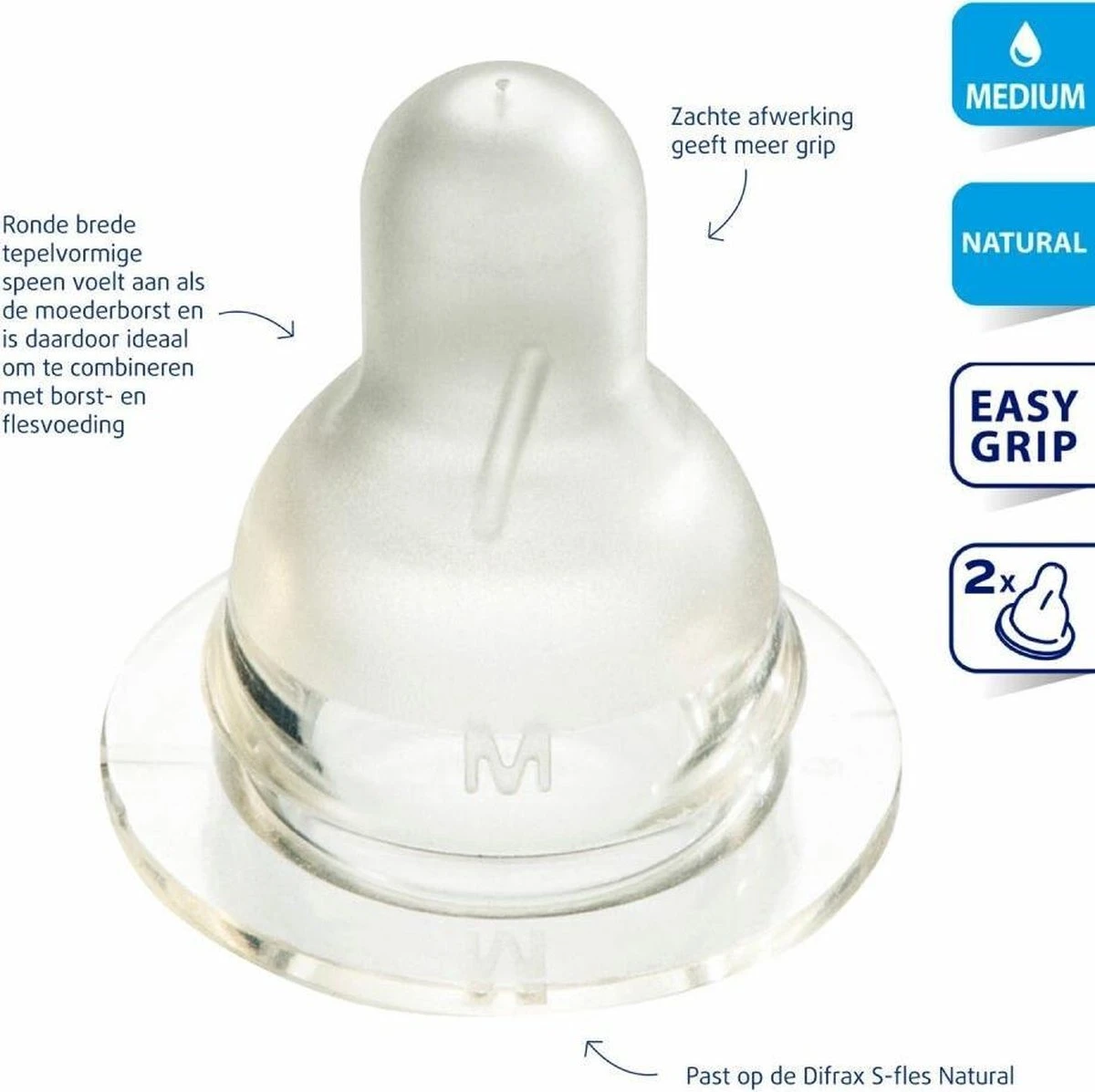 De Difrax Flessenspeen Natural Medium voor de smalle S-fles heeft een zachte ronde tepelvormige speen die lijkt op de moederborst. Hierdoor is borst- en flesvoeding goed te combineren.