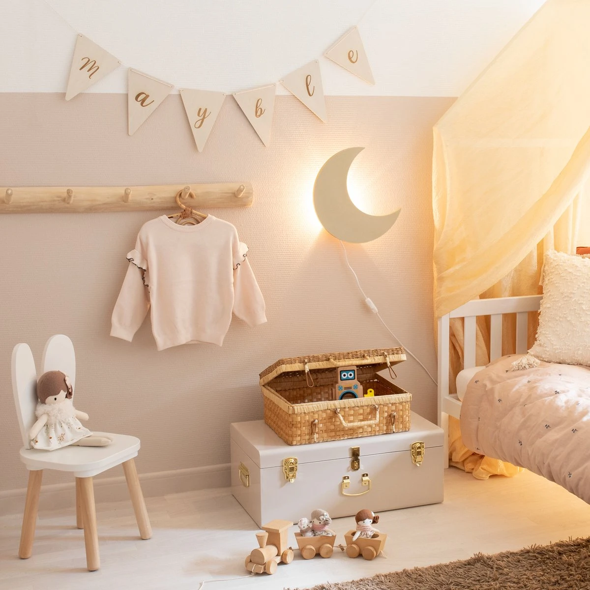 Deze kinderlamp/wandlamp is gemaakt van hout. Dit nachtlampje is om bij weg te dromen. Het is ook precies wat je nodig hebt als je kind bang is in het donker bijvoorbeeld. Deze schemerlamp staat ook super hip op de muur van de babykamer. De vorm van de maan, maakt hem extra leuk om naar te kijken.