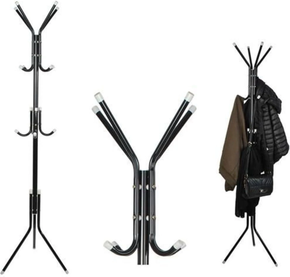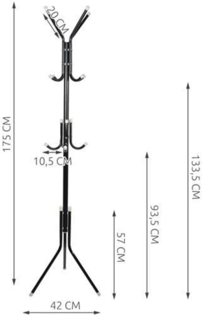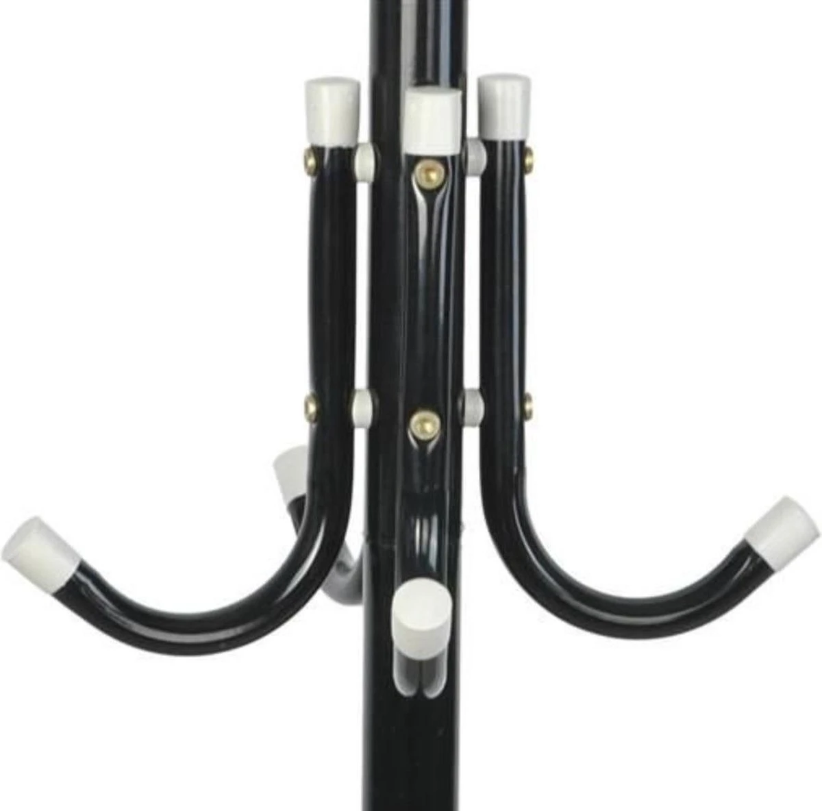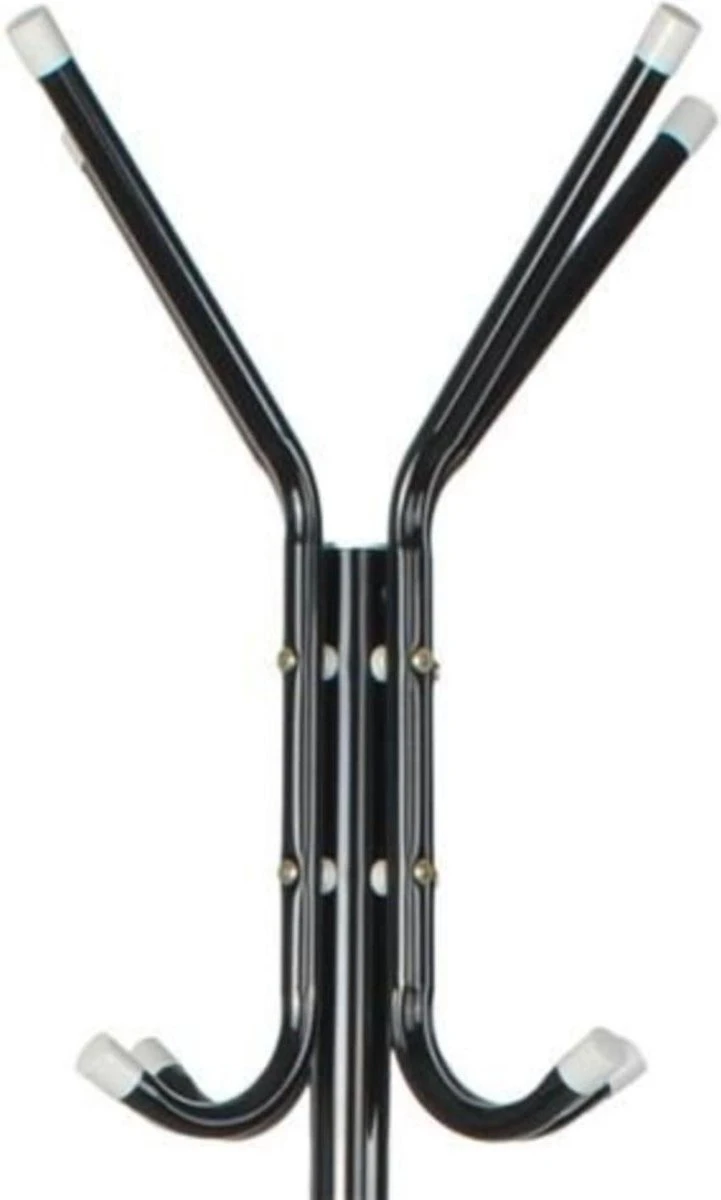De kapstok is gemaakt van stevig staal en de voet met 3 poten zorgt voor de nodige stabiliteit. De kapstok is voorzien van een zwarte coating en beschikt in totaal over 12 haken op 3 verschillende niveaus. De haken zijn afgedekt met kunststof doppen die ervoor zorgen dat je jassen, sjaals en hoeden niet beschadigen.