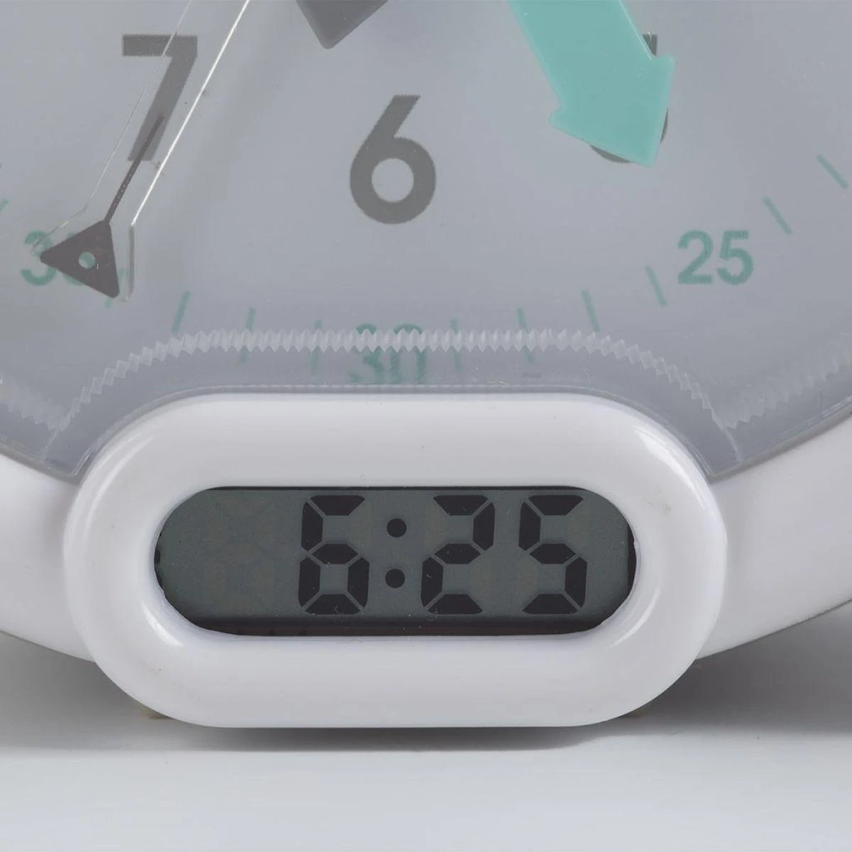 De klok heeft een analoge klok (met wijzers) en een digitale klok, zodat je kind op alle manieren de tijd leert lezen. De klok is tevens als wekker te gebruiken, waarbij gekozen kan worden uit drie weksignalen: trein, koekoek of vogelgezang. Met een knop om te ‘snoozen’ en de klok te verlichten.