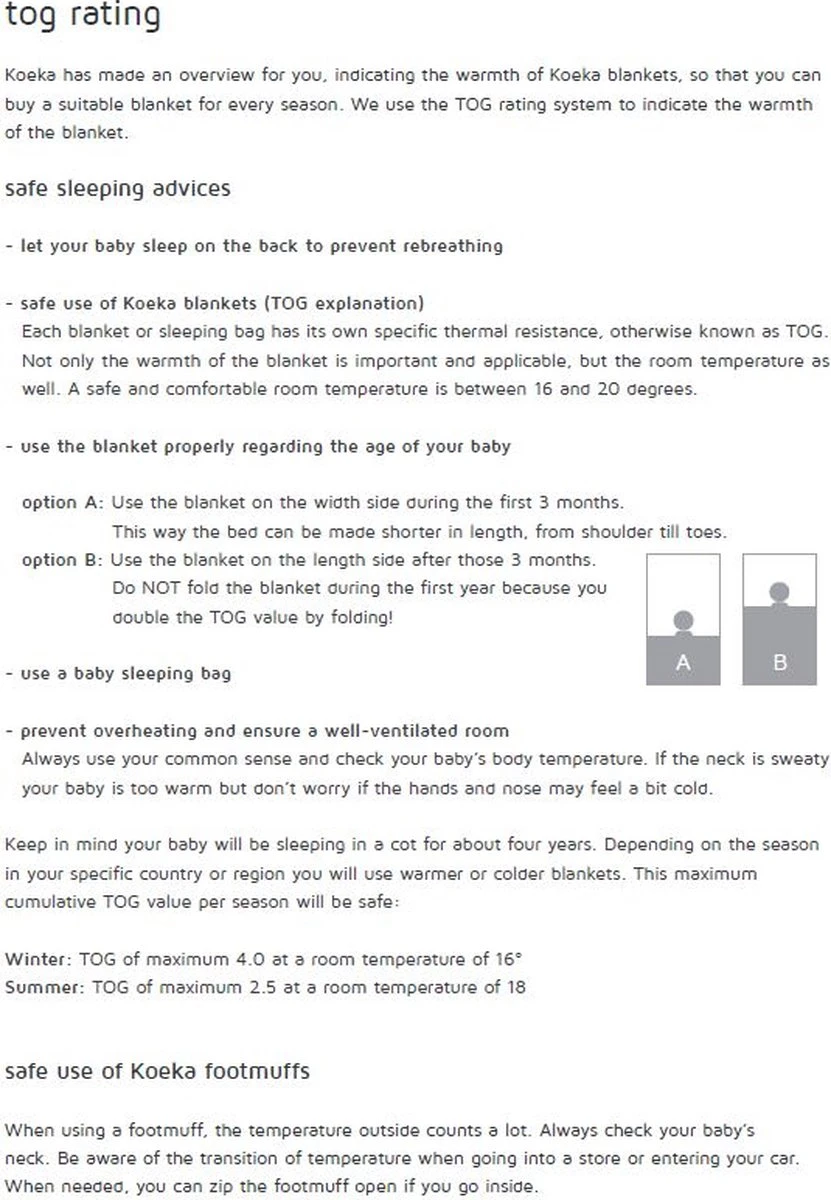 Wij snappen dat het lastig kan zijn om te bepalen welke deken je nu het beste kunt kopen. De juiste keuze hangt af van een aantal factoren en daarom heeft Koeka een keuzehulp samengesteld om je op weg te helpen. Deze “How to choose your blanket” keuzehulp vind je tussen de afbeeldingen. Meet de kamertemperatuur van je kinderkamer en bepaal wat de TOG waarde is van de slaapzak, pyjama en lakentje (als je die gebruikt). Raadpleeg daarna de keuzehulp om te bepalen wat het advies is voor de minimale en maximale TOG waarde van je deken.