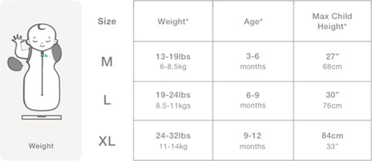 Je kiest de grootte van je Swaddle Up™ Overgangsslaapzak volgens het gewicht van je baby. Belangrijk is om de maat níet op basis van de leeftijd van je baby te kiezen.