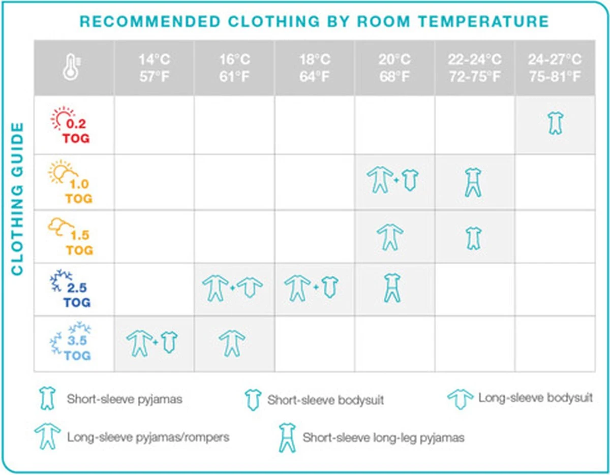 Tip: bekijk de TOG-waardetabel op de afbeelding voor het kledingadvies onder de De Swaddle Up™ Overgangsslaapzak.