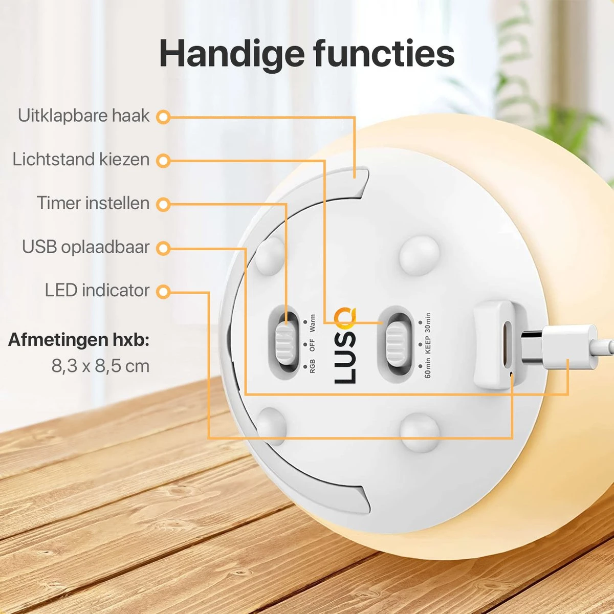Het LUSQ nachtlampje voor kinderen is eenvoudig te gebruiken en geeft warm wit licht. Het sfeervolle lampje beschikt over verschillende dimfuncties, is multifunctioneel en te gebruiken in elke omgeving.
