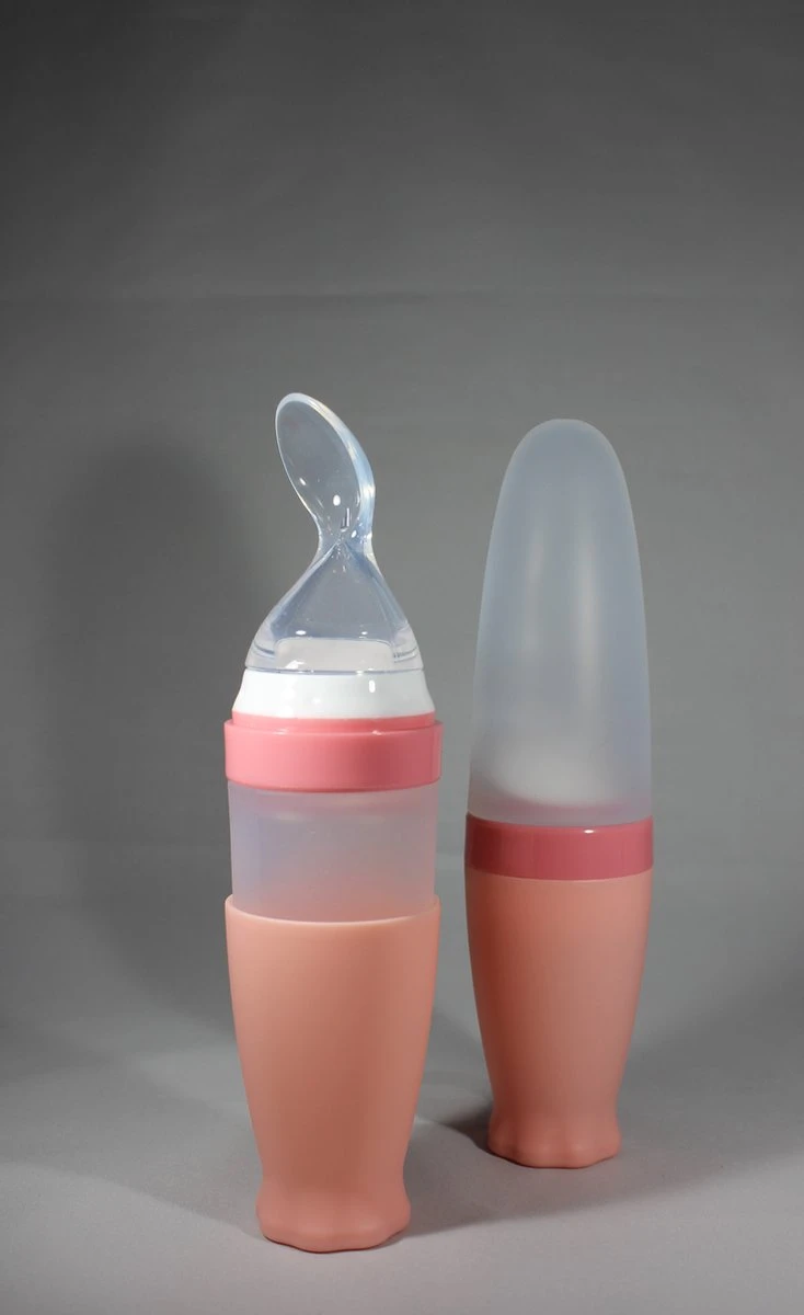 Het flesje combineert namelijk de functie van een fles en een lepel.