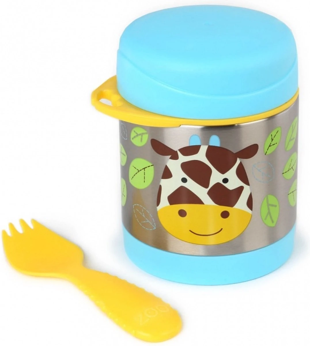 De vrolijke ‘Zoo’ food jar is een thermische bewaardoos voor warme of koude kinderporties. De bewaardoos houdt voedsel 7 uur warm of 5 uur koud en heeft een inhoud van 325 ml. Komt met een ‘spork’: spoon & fork. Het 2-in-1 vork en lepeltje bevestig je makkelijk aan de stevige houder.