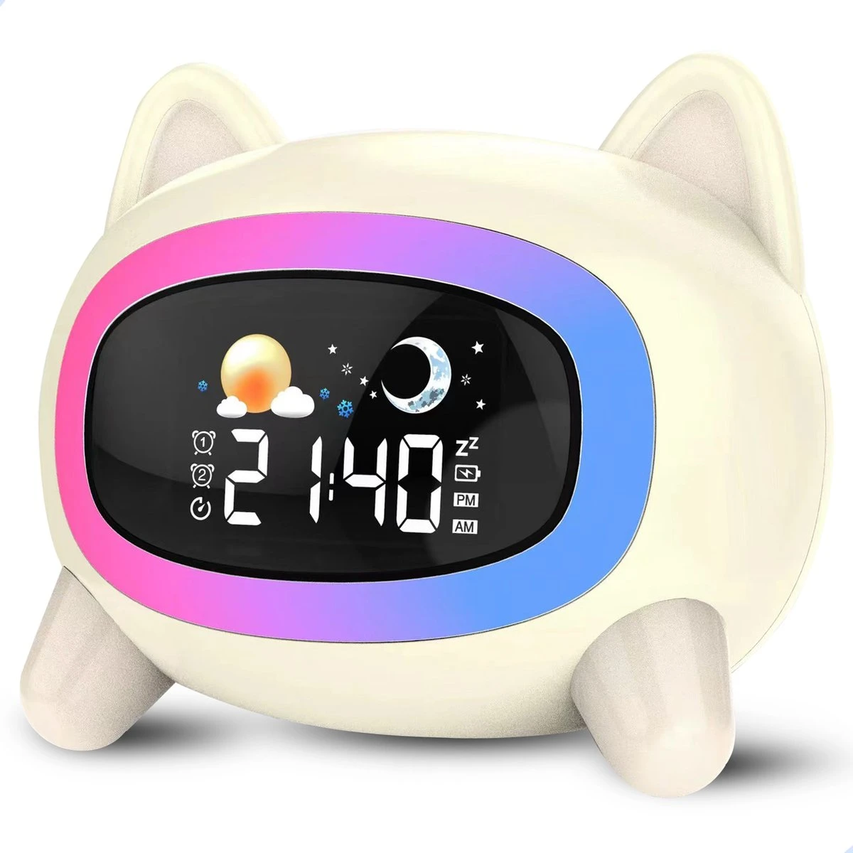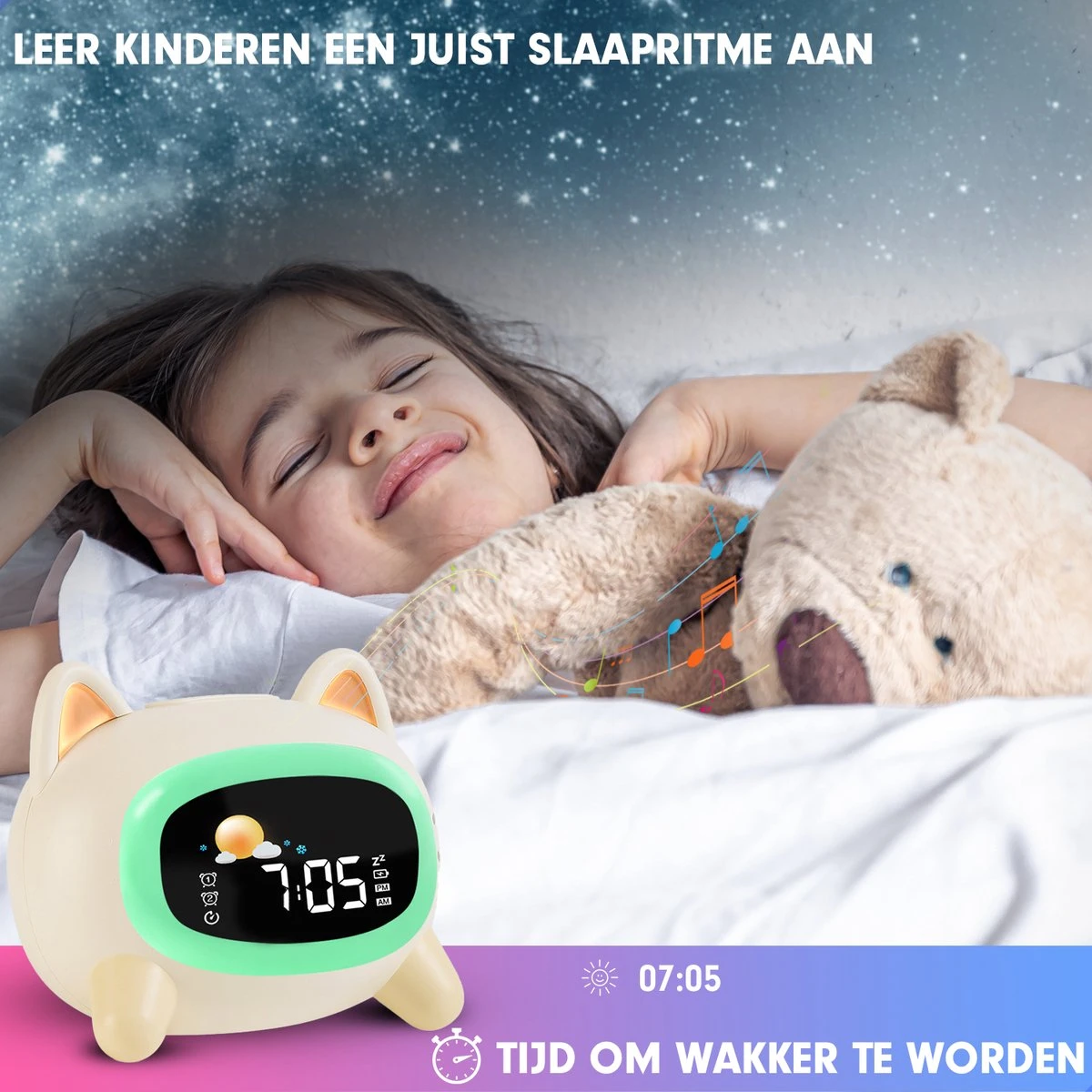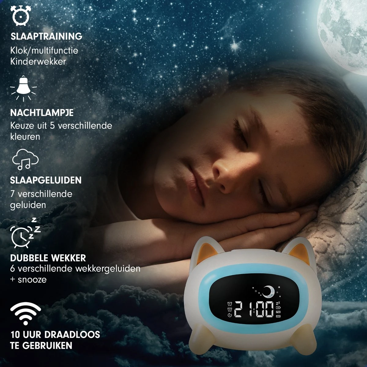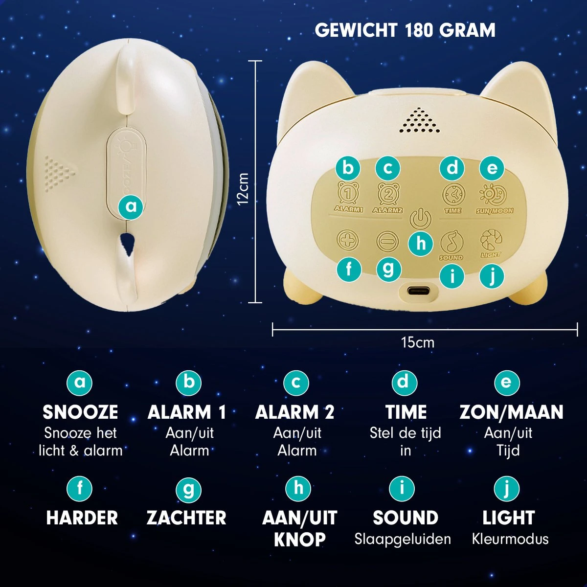 De slaaptrainer heeft meerdere functies, waardoor deze ideaal is om je kind in contact te brengen met een gezond slaapritme. Het is mogelijk om de slaaptrainer in ste stellen op dag- en nacht stand. Op deze manier is er in de nacht als je kleintje moet slapen een maantje te zien, en zodra hij mag opstaan, aangezien de dag weer is begonnen een zonnetje te zien. Het is doormiddel van de digitale klok mogelijk om de slaaptrainer zelf in te stellen op de juiste alarmtijden dat je kleintje mag opstaan. De wekker zal afgaan, die je kleintje vervolgens zelf eenvoudig uit kan zetten. Het licht zal blijven branden, zodat het kleintje weet dat hij/zij mag opstaan.